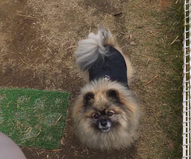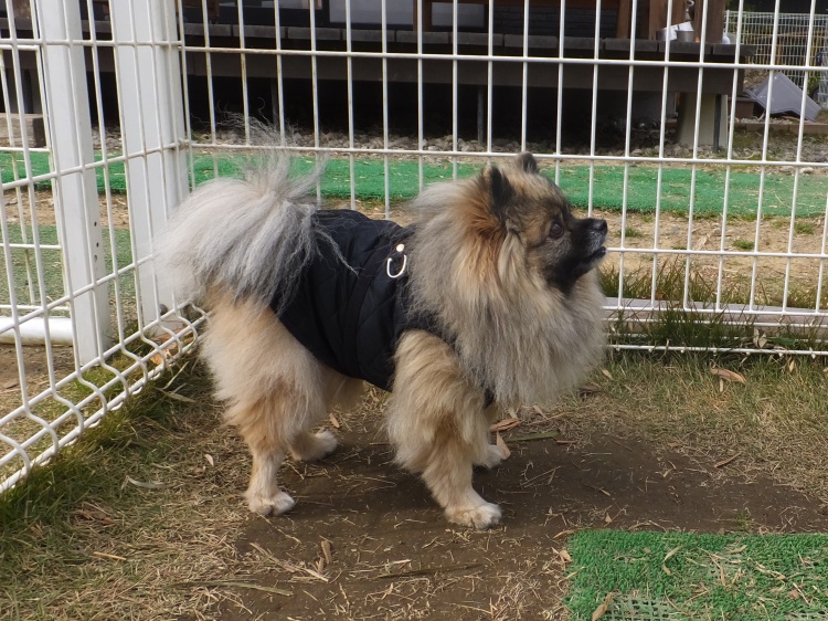 ポメMIXのポンキチ君、モフモフの被毛の他に暖かそうなベスト着用です^^