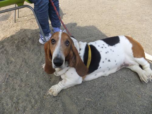 午前中に来てくれたマロンちゃん、パラソルの日陰にゴロリ^^