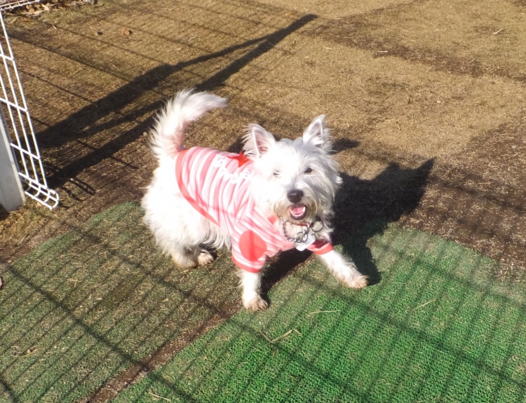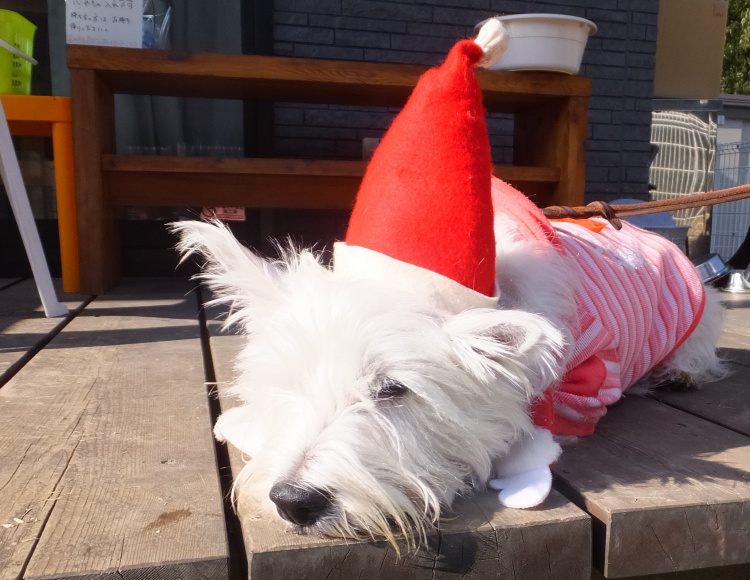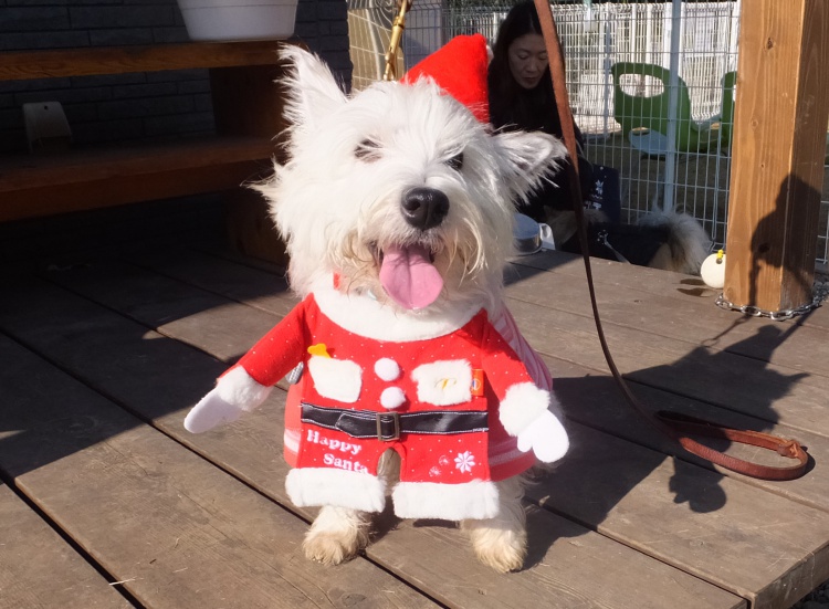 ウェスティーのモモちゃんは芝のフィールドで遊んだあと、サンタのコスプレしてみました^^