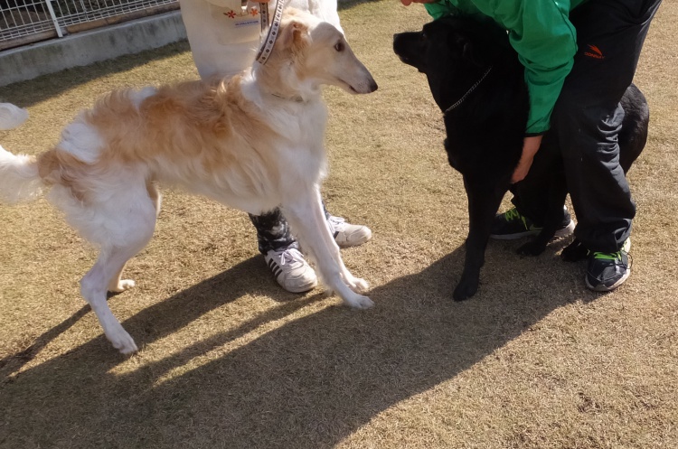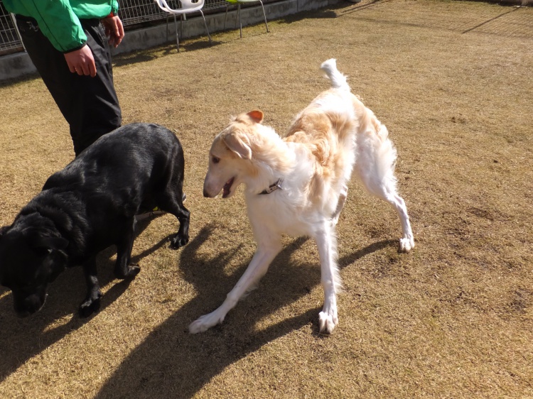 ボルゾイのこうた君はしつけのお勉強のあと、芝のフィールドで遊びました。