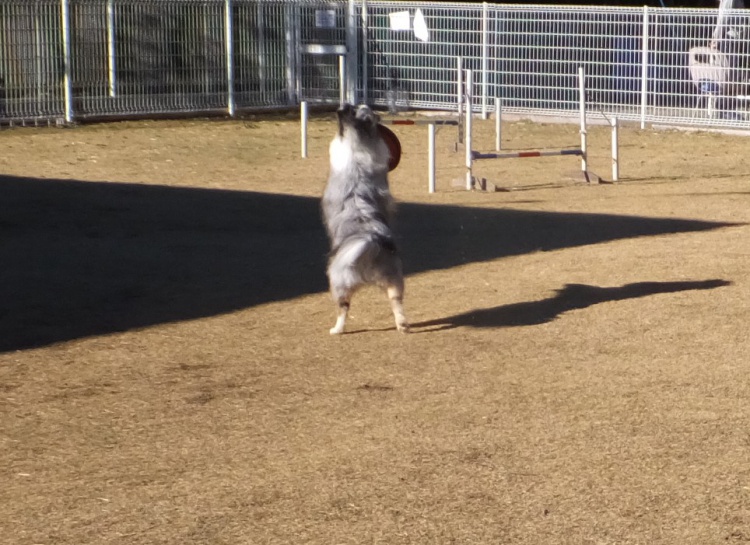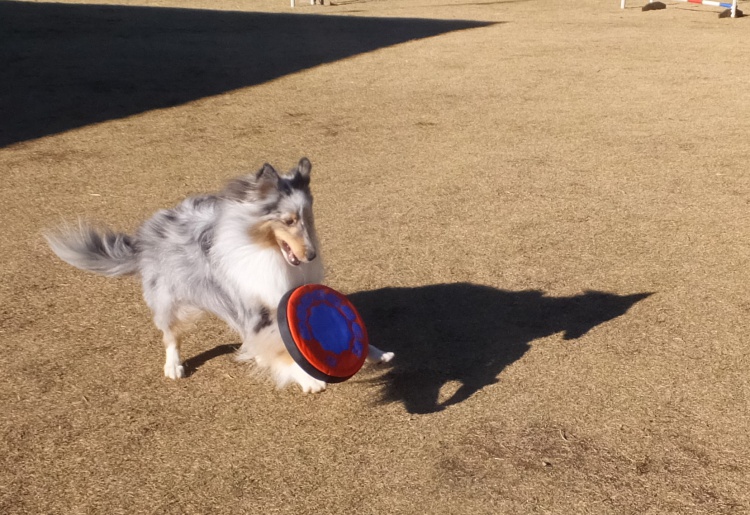 シェルティーのアイル君、アジリティーの練習の前にディスクでウォーミングアップ^^