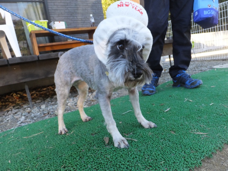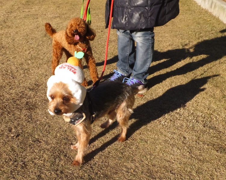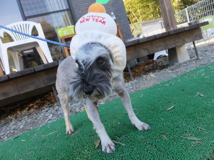 ロンちゃんは鏡餅のコスプレ・・・気に入ったようです^^