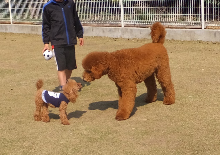 はじめましてのスタンダードプードルのレックス君が来て、モナカちゃんココアちゃん興味津々