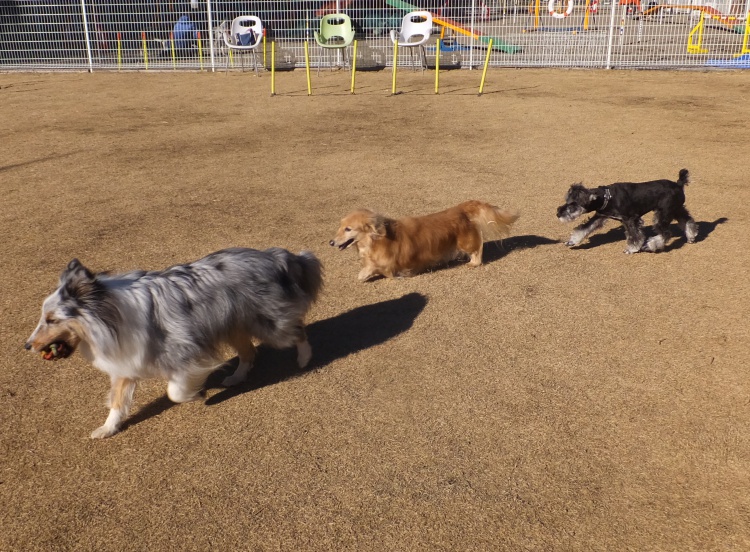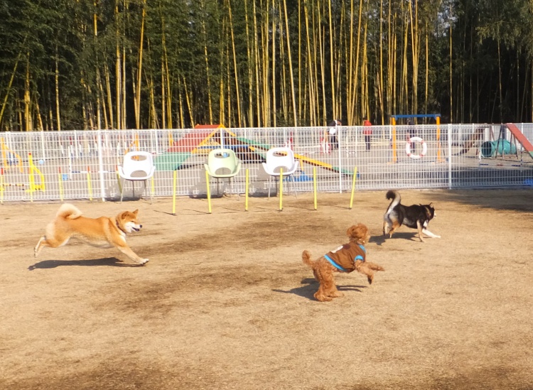 柴犬の琥珀君、大和君、トイプードルのリオン君3兄弟は芝のフィールドでガンガン走ります@@