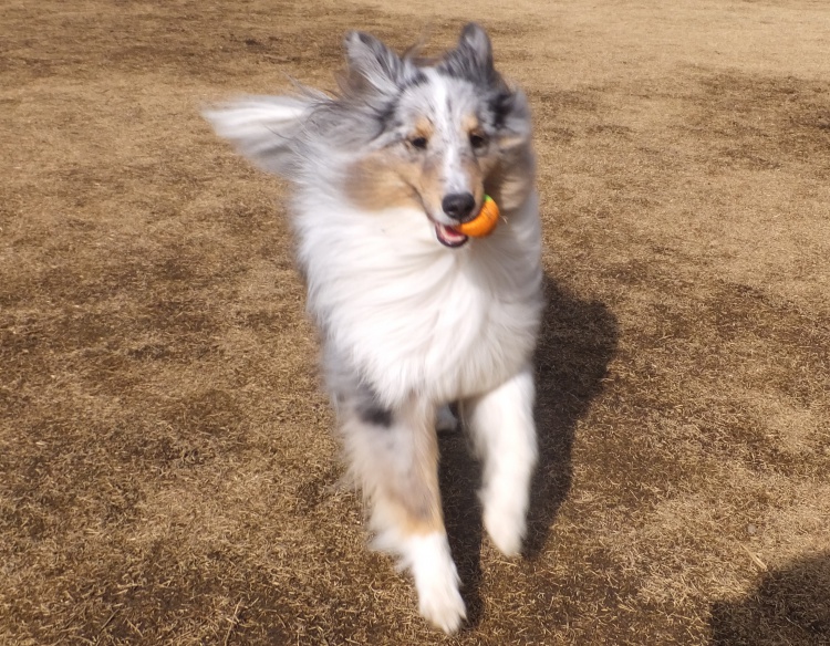 シェルティーのアイル君は芝のフィールドでも遊びました。