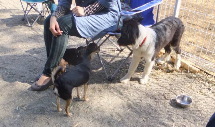 後から来たパピヨンのラッピーちゃんファミリーとワンコ同士のご挨拶の練習です。
