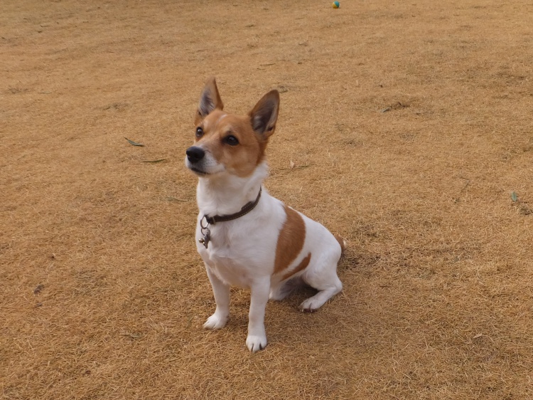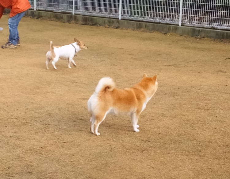 ジャックラッセルテリアのチャッピーちゃん、愛ちゃんと微妙な距離(@@;