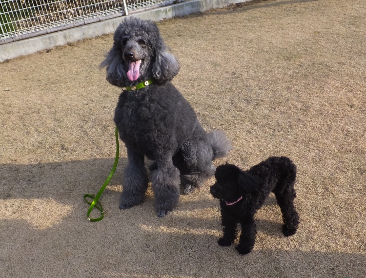 スタンダードプードルのマツリカちゃん^^トイプーのチョコちゃんが見上げて・・大きい!!マツリカちゃん体重はチョコちゃんの10倍以上です(@@)