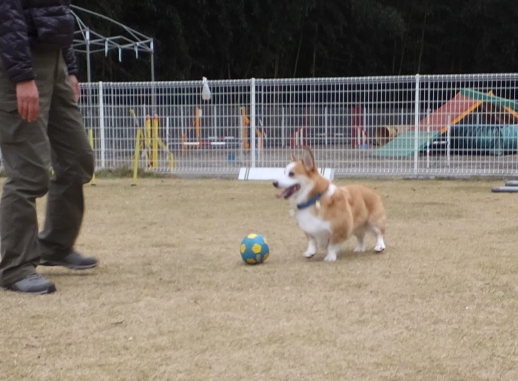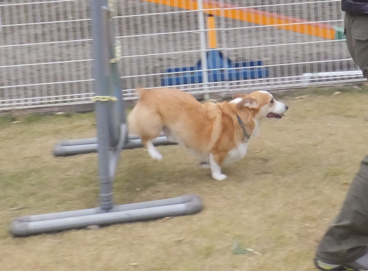 コーギーのケンシロー君は芝のフィールドでアジリティーのお勉強^^