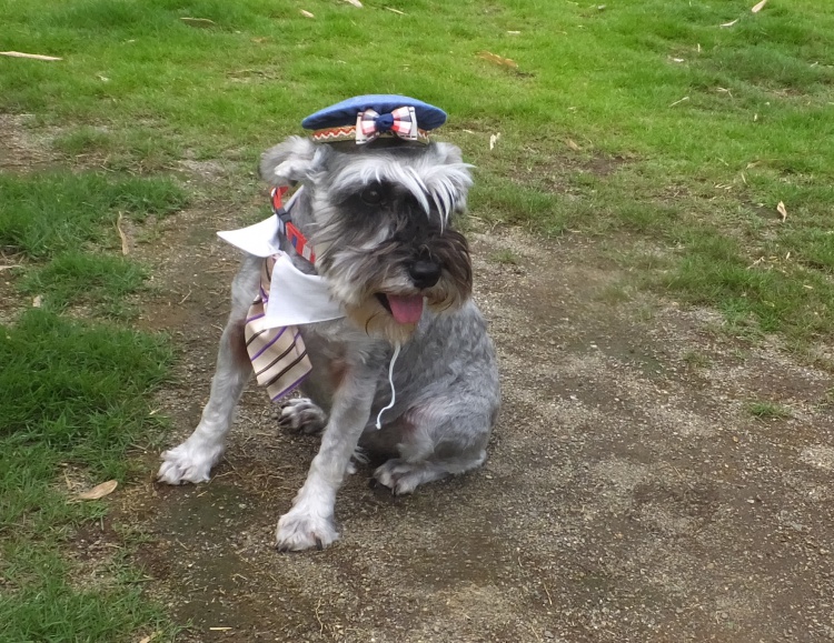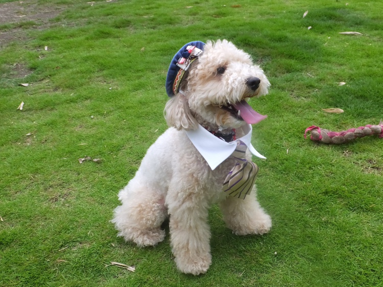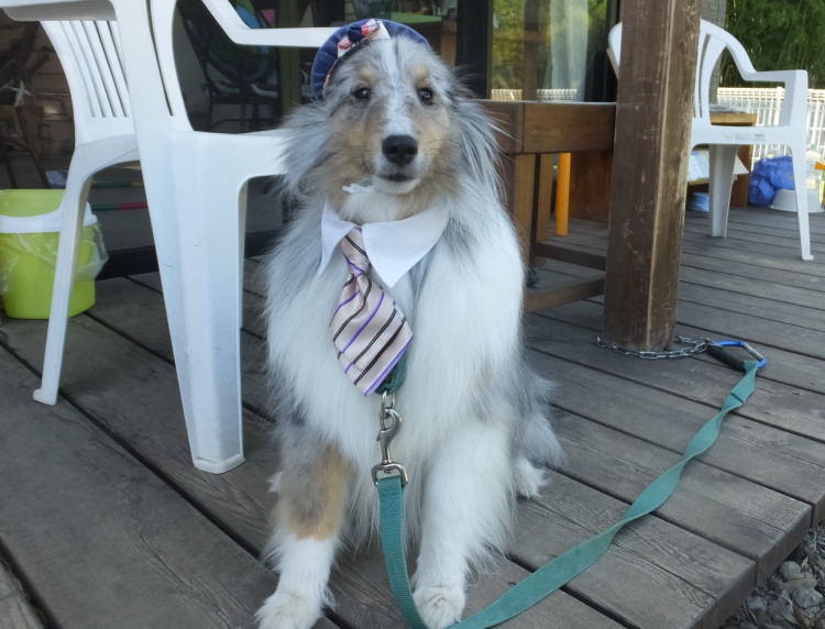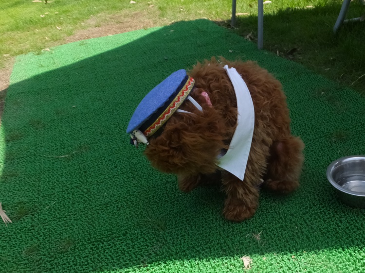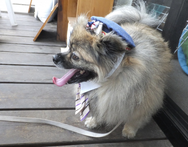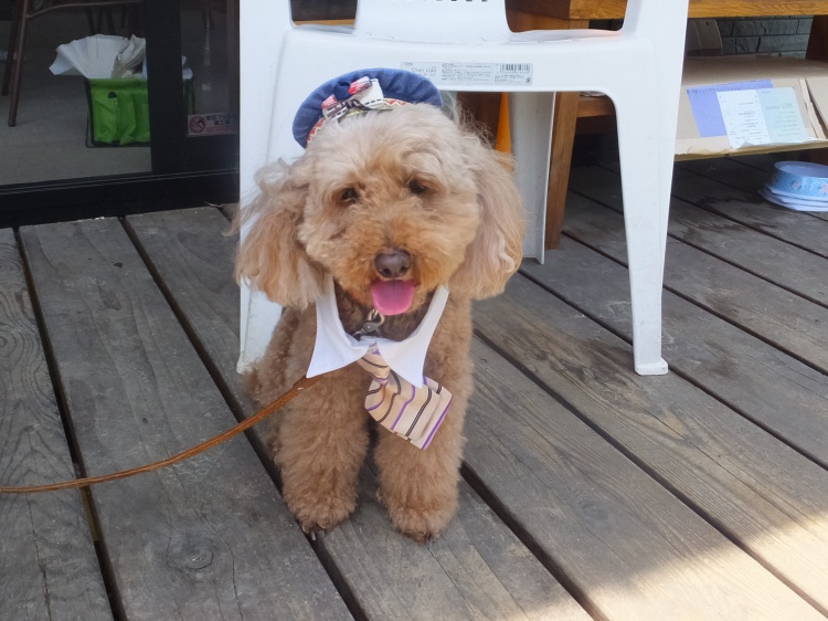ポンキチ君とあずきちゃん、ウッドデッキで一休み・・・あられママが作ってくれた車掌コスプレに挑戦です^^