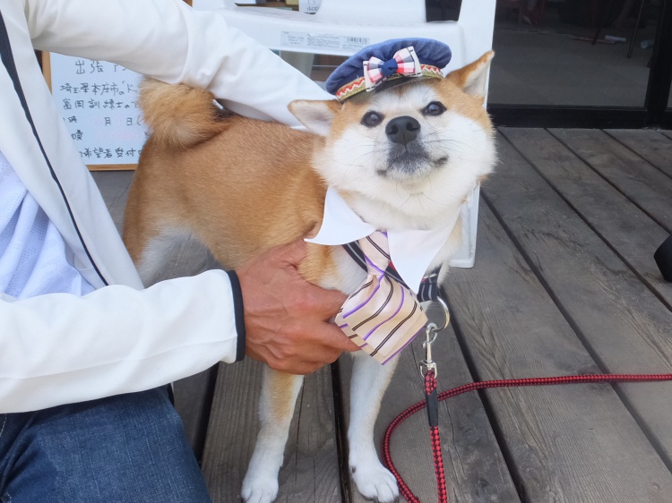 柴犬の愛ちゃんはあられママが作ってくれた車掌さんコスプレ似合ってます^^