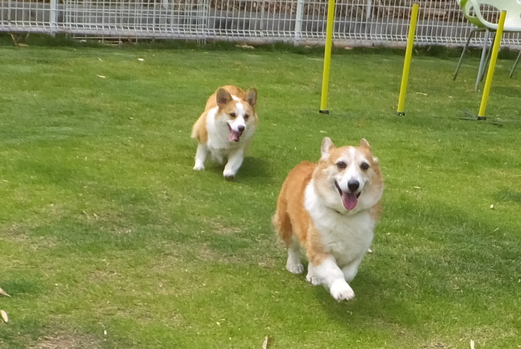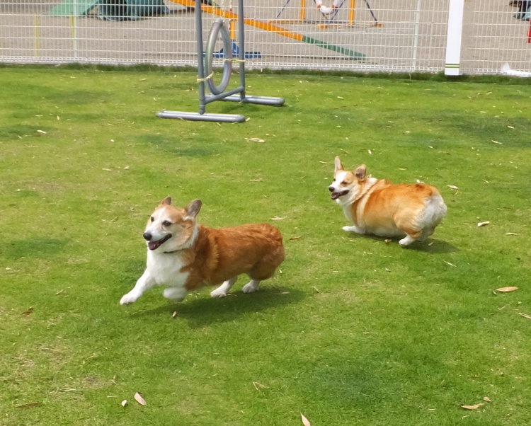 コーギーのさくらちゃんが来て、もみじちゃん大喜び^^遊んで遊んでって♪