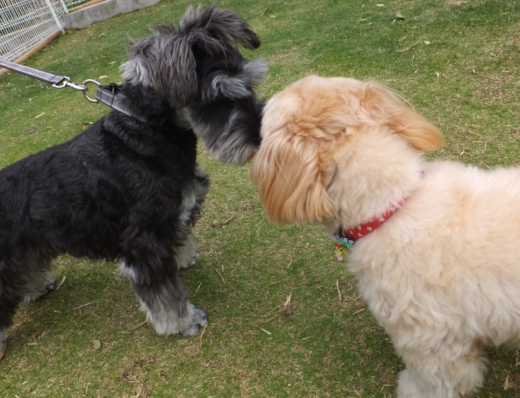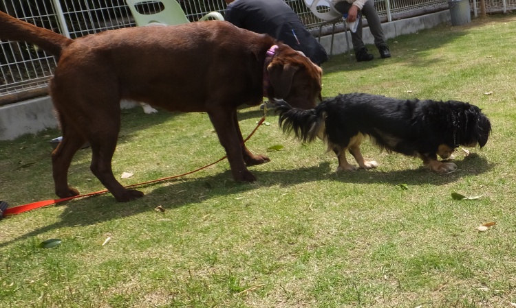 Mダックスのエリザちゃんトイプードルのシエルちゃんがきて、大きなララちゃんマロンちゃんにビックリ(@@