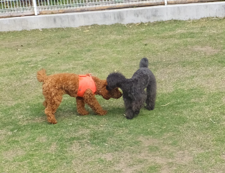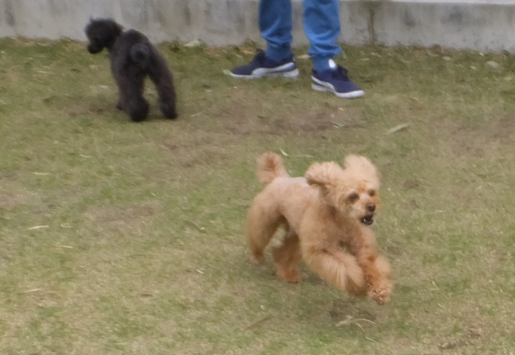 優しいクックちゃん、後から来たトイプーMIXのハナちゃんにタジタジです^^