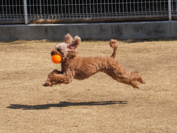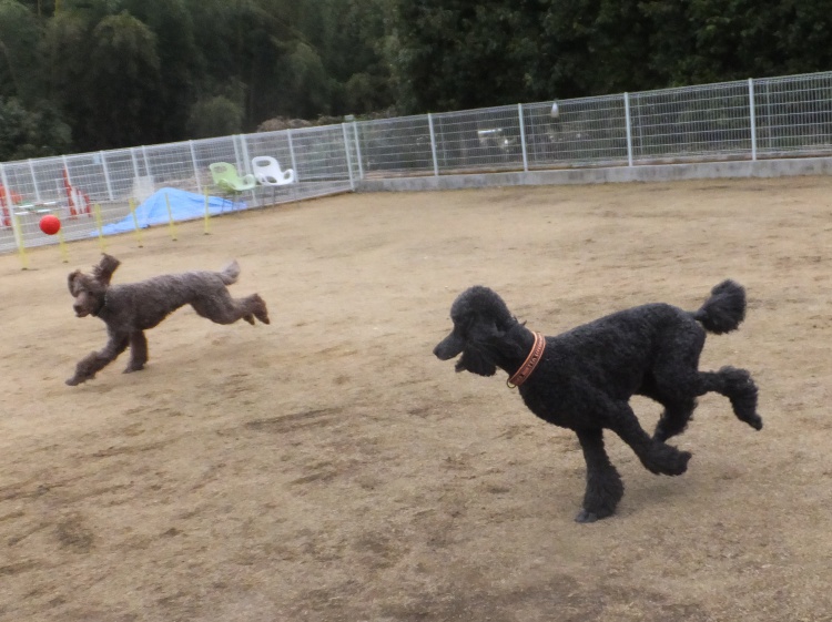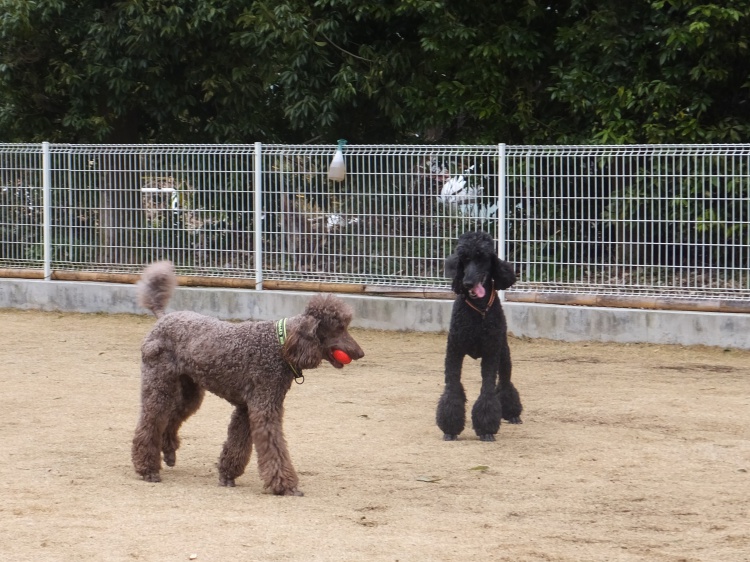 スタンダードプードルのエリーちゃんとディップ君ボール遊び大好きです^^