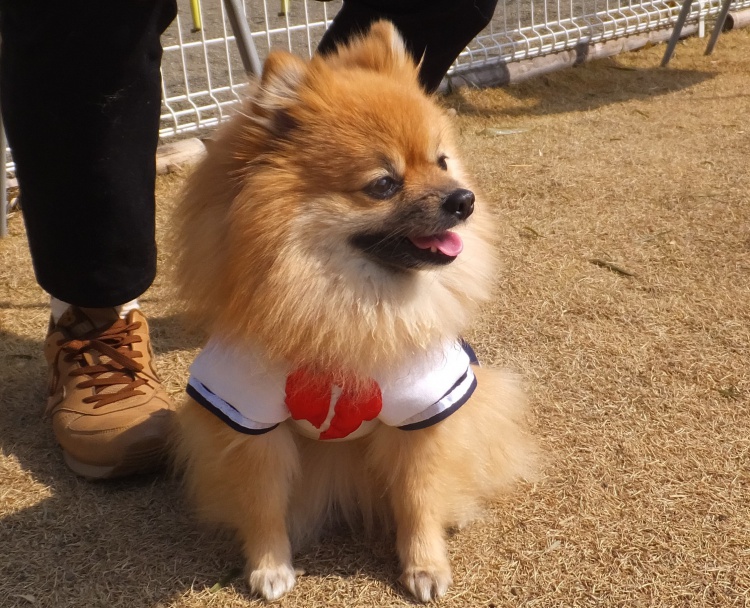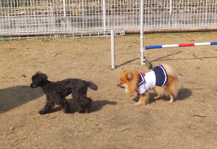ポメラニアンのモコちゃんジャンプが上手です^^カイト君に興味津々(・・?