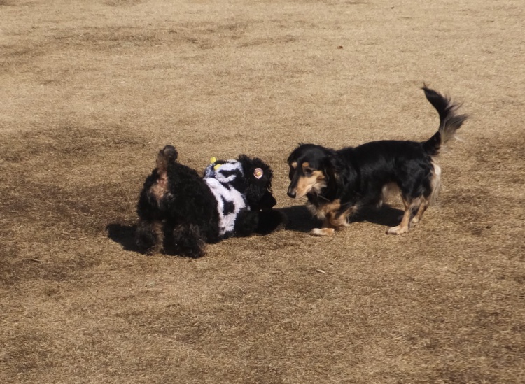ラブラドールレドリバーのララちゃんもトイプードルのアンジュちゃん、遊ぼうっていっても知らん顔です。