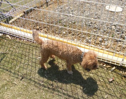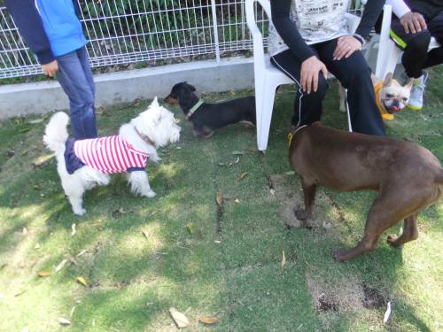 ドッグラン初めてというムサシくんは色々なワンコのおしっこの匂いが気になるのか・・・・マーキングを多くしていたので、パパさんは消臭剤をかけながらムサシくんを叱っていましたが・・・・
