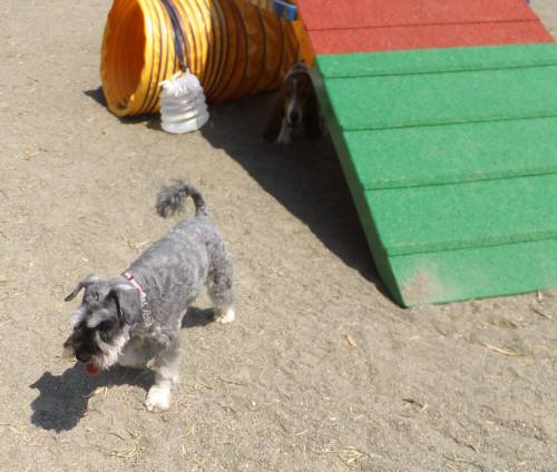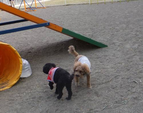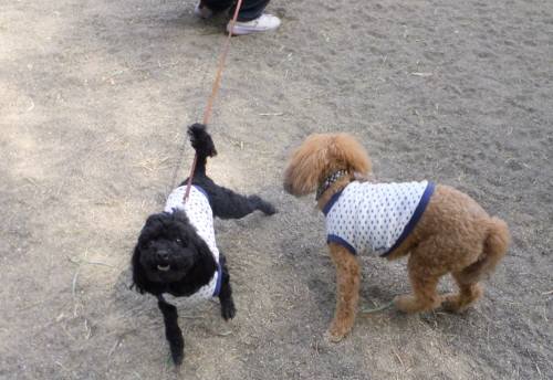 まめちゃんはモテモテの男の子で、ほぼ同時に来たマロンちゃんにも気に入られたようです。マロンちゃんは気が良いので、吠えられても平然としてまめちゃんの後を付いて回っていました^^
